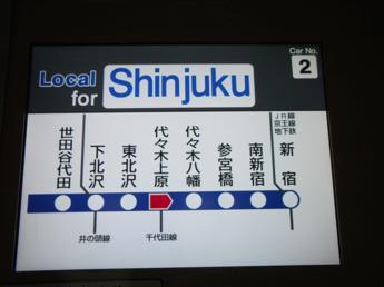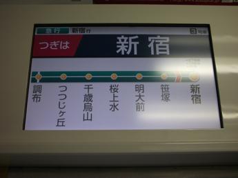 京王線新宿行き急行。笹塚を発車すると次は終点・京王線新宿まで停車しないため、幡ヶ谷・初台の両駅へは笹塚で乗り換えるよう案内される。
