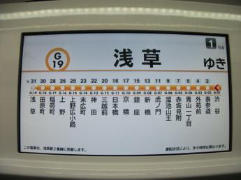 浅草行き、始発の渋谷駅に停車中。車内LCD画面でも浅草駅の到着番線(下右)を案内する。