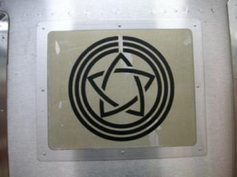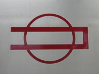 (左)大阪市交通局の局章(御堂筋線21系電車)。大阪市の市章「みおつくし」と「電」の字を合体させ、丸くデフォルメしている。前身の「大阪市電気局」から引き継ぎ、大阪市電を経て、現在の大阪市営地下鉄の各車両に付いている。