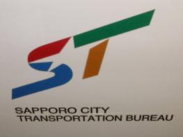 札幌市交通局のロゴマーク。「Sapporo City Transportation Bureau」から「ST」としており、マークの中に「星」が隠されている。左は地下鉄南北線5000形電車、右は真駒内駅ホーム上にある発車標。